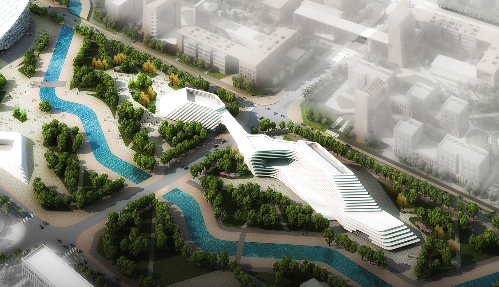 科學(xué)講堂位于中心區(qū)景觀主軸的中心腹地,其南的泄洪渠為景觀主軸的景觀帶。設(shè)計靈感源于中國天人合一的自然觀和社會觀,所謂仁者樂山智者樂水,通過對山、水肌理的分析與重構(gòu),轉(zhuǎn)換為建筑語言,形成獨(dú)具特色的建筑造型。建筑體量形成簡單、沖突的場地氛圍,建筑南向正對園區(qū)中軸線,使得水平向延展的建筑生成了“東高西低”的無邊際界面。由“水面→河岸→場地→建筑”的溪水肌理驅(qū)動建筑臨街面,逐步退后產(chǎn)生特有的河流沖刷意象。水流的蜿蜒曲折使建筑的轉(zhuǎn)彎處成洞,達(dá)到了內(nèi)外視線連續(xù)的綜合效果,并將對建筑的擠壓力平衡到建筑東西兩翼。建筑表皮通過對水的情緒變化等模擬,形成片狀的建筑造型。