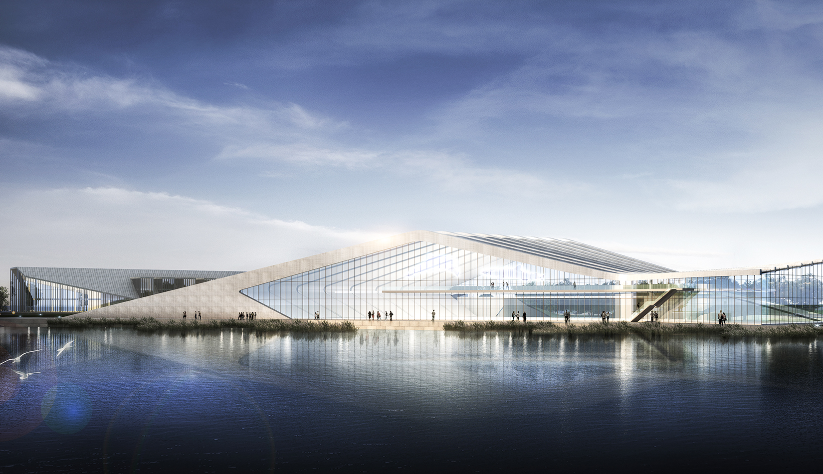 海洋科技館坐落在中科院青島科教園沿海區(qū)的中心地帶,沿海岸線呈一字型布局。方案設(shè)計(jì)以浪花和貝殼為意象,建筑像從場地中生長出來,擁有著與海浪一樣流暢的外形,在與基址和諧相融的同時(shí),也呼應(yīng)著青島的城市文化和人文關(guān)系。大跨度鋼結(jié)構(gòu)結(jié)構(gòu)排架為大空間的開放展示提供了可能,同時(shí)營造了無間斷的觀??臻g??萍拣^外墻以玻璃幕墻為主,保證了觀海景觀通透性。