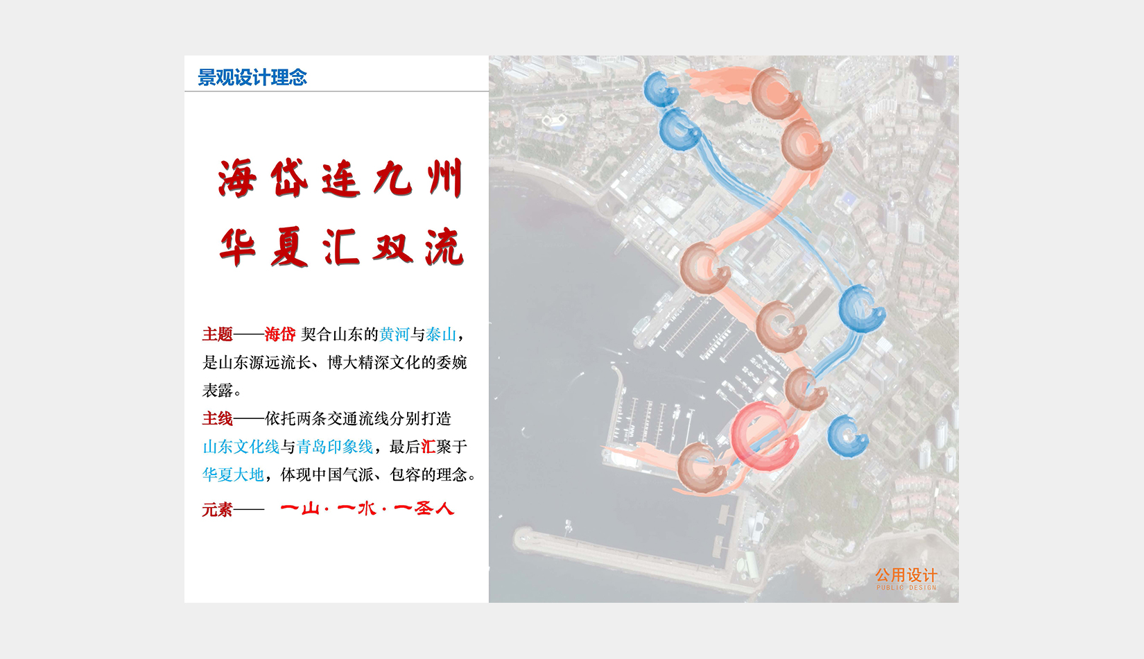 在此基礎(chǔ)上,確定迎賓動(dòng)線方案,完善整個(gè)區(qū)域動(dòng)態(tài)及靜態(tài)交通規(guī)劃,結(jié)合奧帆中心原有的景觀資源和山東、青島文化元素,以“海岱連九州,華夏匯雙流”為景觀設(shè)計(jì)理念,布局重要景觀標(biāo)志節(jié)點(diǎn)。