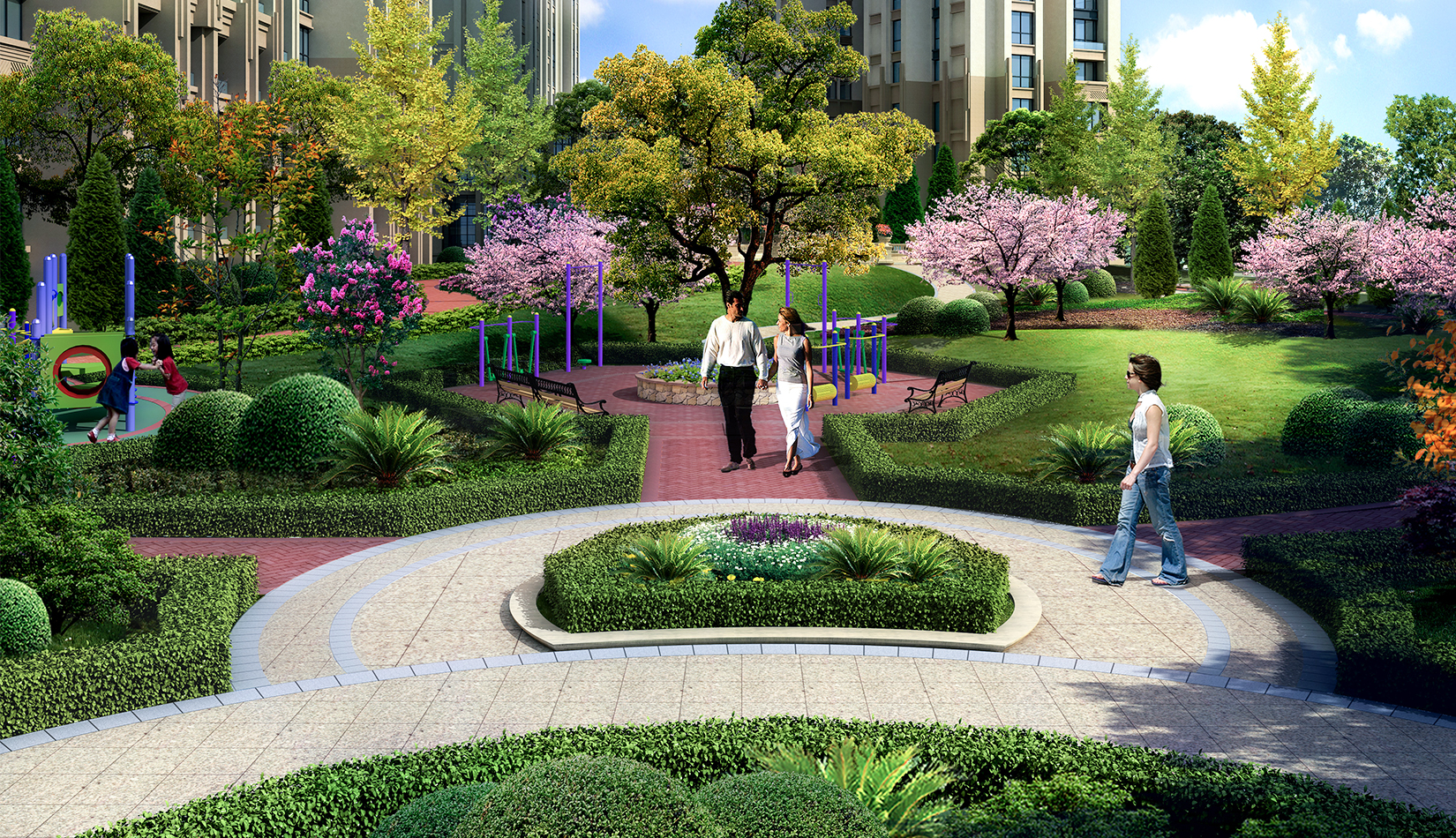 通過(guò)“主題式功能景觀區(qū)”的設(shè)計(jì)手法,提煉法式景觀中的經(jīng)典要素,進(jìn)行合理的空間組織,形成以人為本、和諧有序、經(jīng)濟(jì)優(yōu)美、功能齊全的居住區(qū)園林景觀系統(tǒng),使戶戶在家中就都能看見(jiàn)并享受具有尊貴、典雅、悠閑特色的住宅區(qū)景觀。