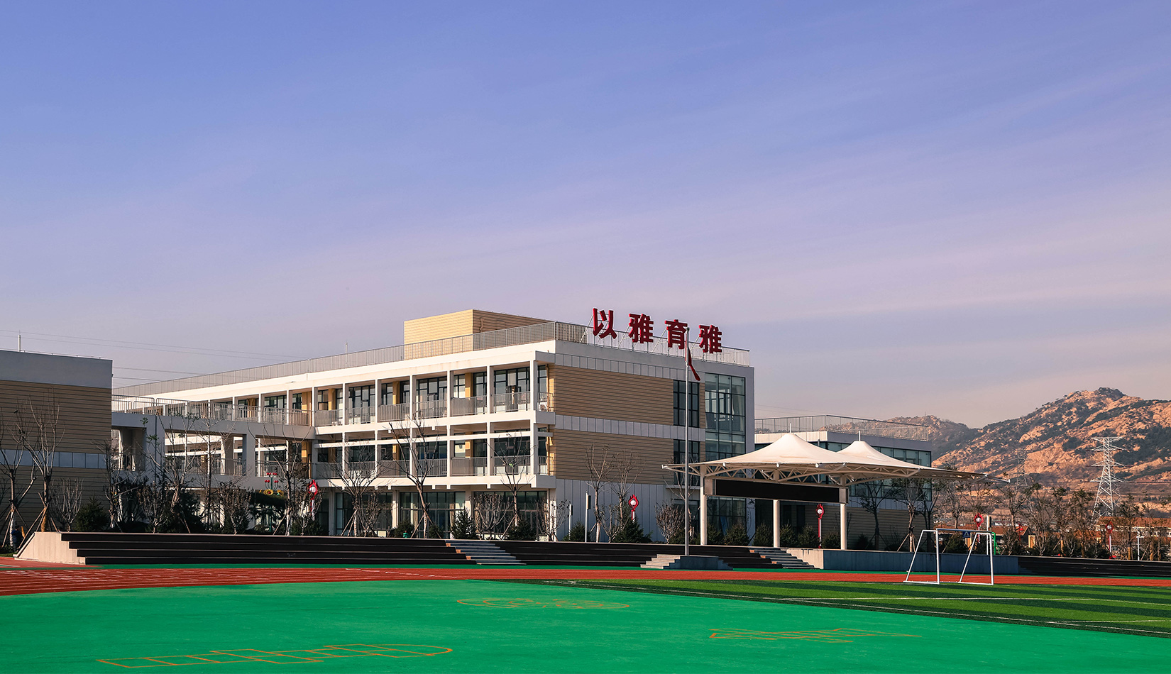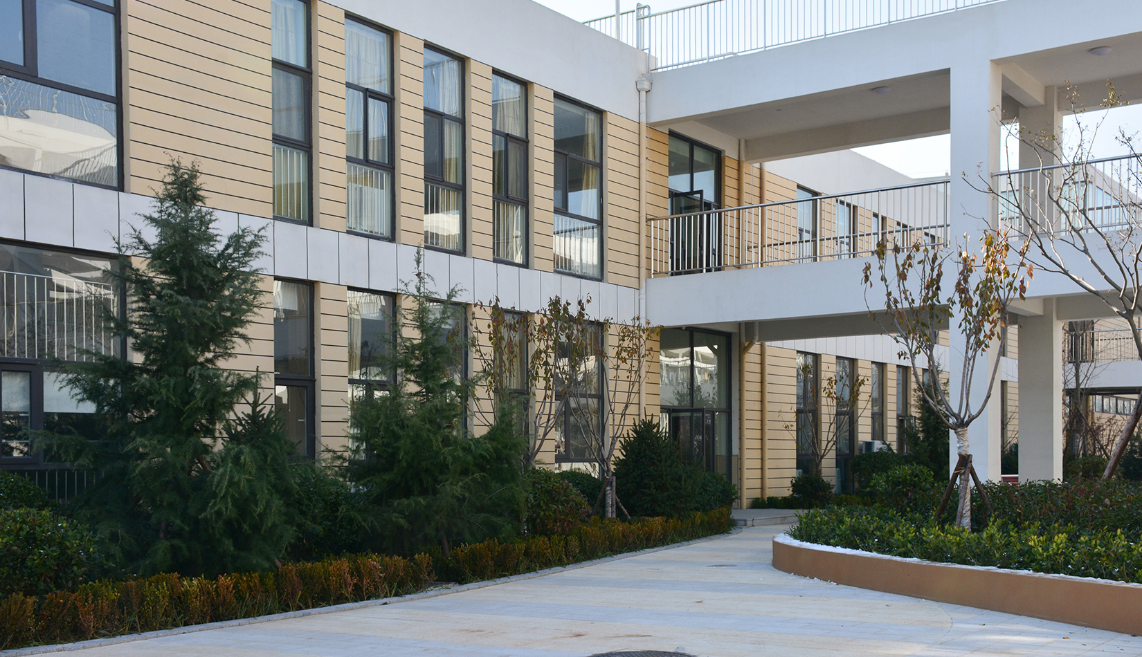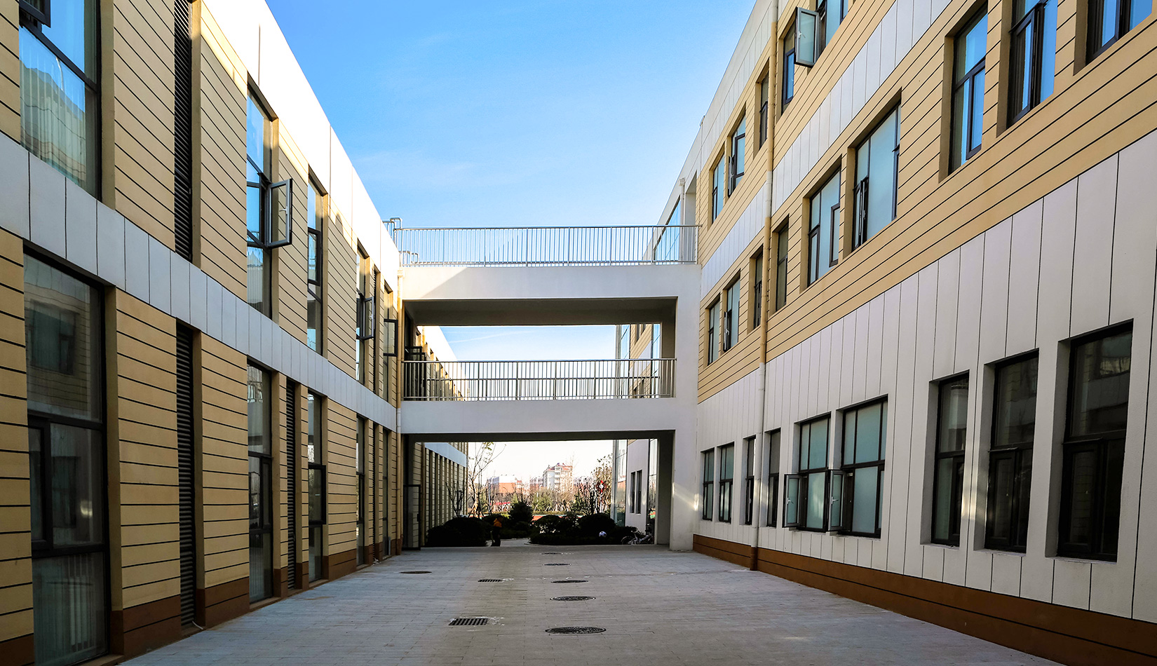 該項(xiàng)目通過幾個(gè)建筑單體與架空走廊的穿插連接將整個(gè)校區(qū)有機(jī)聯(lián)系起來,實(shí)現(xiàn)了建筑功能的整體性,完善了建筑可達(dá)性。形成的中庭空間可成為交流為主的平臺(tái),營造了學(xué)習(xí)、活動(dòng)為一體的校園氛圍。建筑外立面以簡潔的現(xiàn)代風(fēng)格為主,同時(shí)表現(xiàn)校園文化,主要采用黃色與白色真石漆形成色彩對比,在教室南立面、樓梯間、就餐區(qū)等采用整體通透的玻璃幕墻與實(shí)墻形成虛實(shí)對比,形成簡潔而不失活潑的建筑風(fēng)格。利用借景等手法進(jìn)行室外綠化設(shè)計(jì),整體打造一個(gè)高品質(zhì)的學(xué)校環(huán)境。