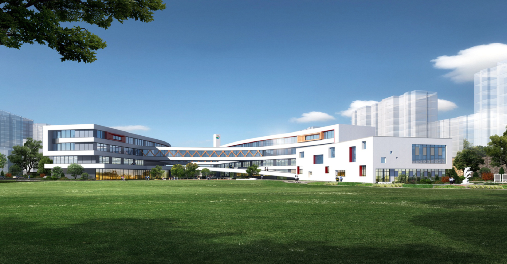 校園規(guī)劃采用曲線手法,營(yíng)造流水姿態(tài),將東側(cè)山脈與西側(cè)河流連接在一起。設(shè)計(jì)現(xiàn)代化“山水”校園,使學(xué)生在自然中成長(zhǎng)。營(yíng)造活水發(fā)源的“源頭”意境,寓意教育為人類文化長(zhǎng)河的源頭,呼應(yīng)學(xué)?!霸搭^”文化。曲線舒展的形體,整體采用白色色調(diào),局部以紅黃色進(jìn)行點(diǎn)綴,風(fēng)格純潔又不失活潑。